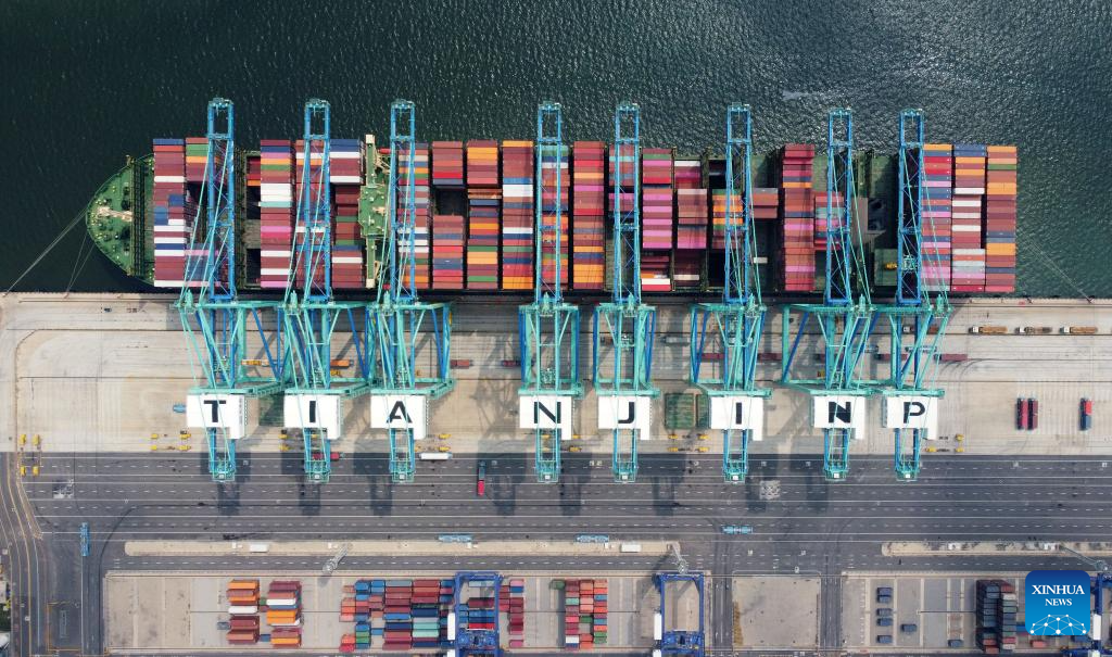 This aerial photo shows a cargo ship at a smart container terminal of Tianjin Port in North China's Tianjin, July 7, 2023. [Photo/Xinhua]