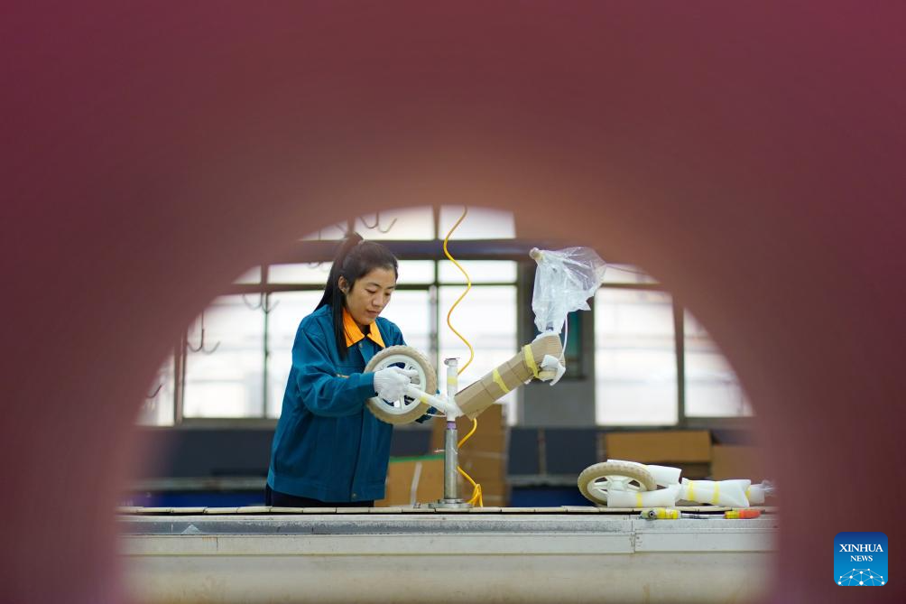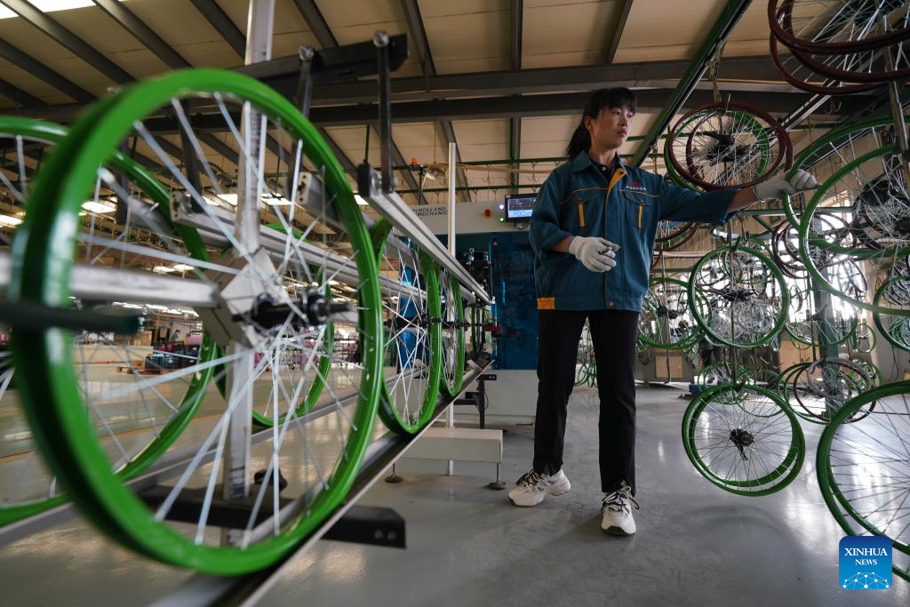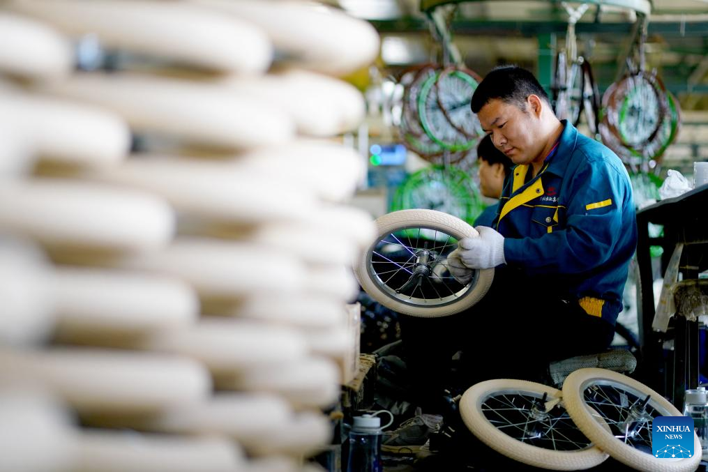 A worker assembles tires for children bicycles at a manufacturing company in Pingxiang County, north China's Hebei Province, Oct. 16, 2023. Pingxiang, dubbed the "city of children wheels," has made great efforts in boosting its children bicycle business in recent years. Products here have been sold to over 60 countries and regions including Russia, Vietnam, Kenya and Sri Lanka. The value of children bicycles directly exported by manufacturers in the county has amounted to 364 million yuan (about 49.76 million U.S. dollars) in the first seven months this year. (Xinhua/Mu Yu)