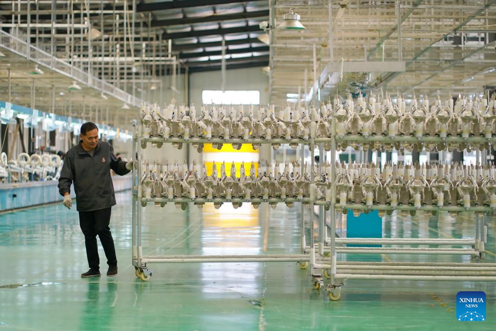A worker operates on the production line of children bicycle at a manufacturing company in Pingxiang County, north China's Hebei Province, Oct. 16, 2023. Pingxiang, dubbed the "city of children wheels," has made great efforts in boosting its children bicycle business in recent years. Products here have been sold to over 60 countries and regions including Russia, Vietnam, Kenya and Sri Lanka. The value of children bicycles directly exported by manufacturers in the county has amounted to 364 million yuan (about 49.76 million U.S. dollars) in the first seven months this year. (Xinhua/Mu Yu)