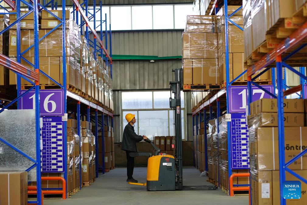 A worker stores children bicycle products at a manufacturing company in Pingxiang County, north China's Hebei Province, Oct. 16, 2023. Pingxiang, dubbed the "city of children wheels," has made great efforts in boosting its children bicycle business in recent years. Products here have been sold to over 60 countries and regions including Russia, Vietnam, Kenya and Sri Lanka. The value of children bicycles directly exported by manufacturers in the county has amounted to 364 million yuan (about 49.76 million U.S. dollars) in the first seven months this year. (Xinhua/Mu Yu)