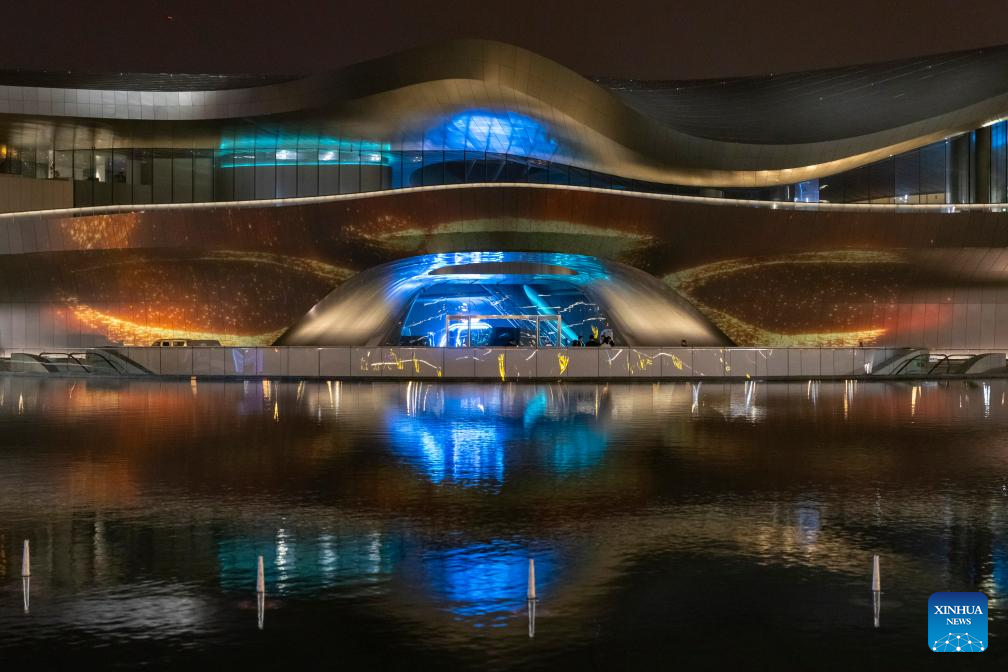 This photo taken on Oct. 16, 2023 shows a night view of the Chengdu Science Museum, main venue for the 81st World Science Fiction Convention (WorldCon), in Chengdu, southwest China's Sichuan Province. The five-day 2023 WorldCon will be opened in Chengdu on Wednesday. (Xinhua/Shen Bohan)