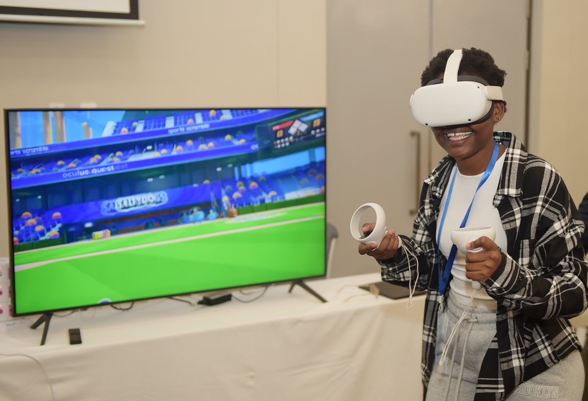 A visitor checks out a VR (virtual reality) headset during an exhibition held by Chinese high-tech company Huawei in Gaborone, capital of Botswana, in March. XINHUA