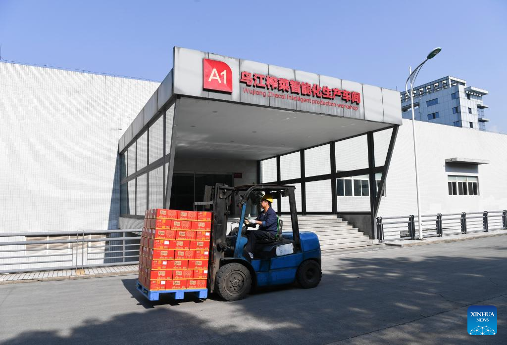An employee drives a forklift to carry Zhacai (pickled mustard tubers) products at Chongqing Fuling Zhacai Group Co., Ltd. in southwest China's Chongqing Municipality, Oct. 16, 2023. The history of pickle-making in Chongqing's Fuling, a major pickle production base, dates back more than 150 years. The district's traditional method of producing preserved mustard tubers was listed as a state-level intangible cultural heritage in 2008.
