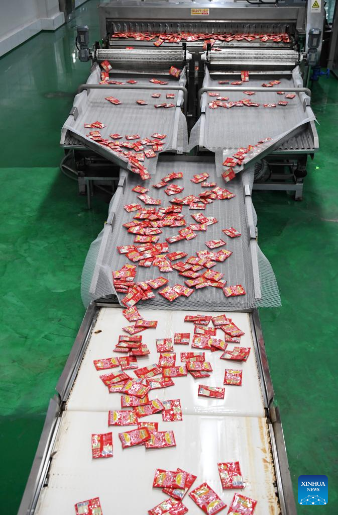 This photo taken on Oct. 16, 2023 shows a production line at an intelligent production workshop of Chongqing Fuling Zhacai Group Co., Ltd. in southwest China's Chongqing Municipality. The history of pickle-making in Chongqing's Fuling, a major pickle production base, dates back more than 150 years. The district's traditional method of producing preserved mustard tubers was listed as a state-level intangible cultural heritage in 2008.