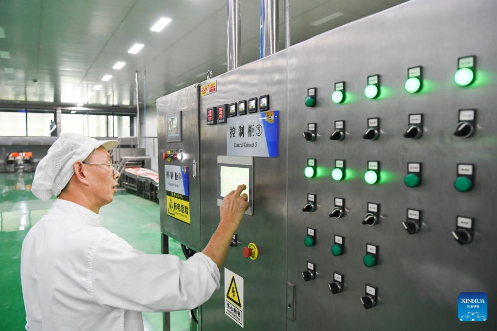 An employee works at an intelligent production workshop of Chongqing Fuling Zhacai Group Co., Ltd. in southwest China's Chongqing Municipality, Oct. 16, 2023. The history of pickle-making in Chongqing's Fuling, a major pickle production base, dates back more than 150 years. The district's traditional method of producing preserved mustard tubers was listed as a state-level intangible cultural heritage in 2008.