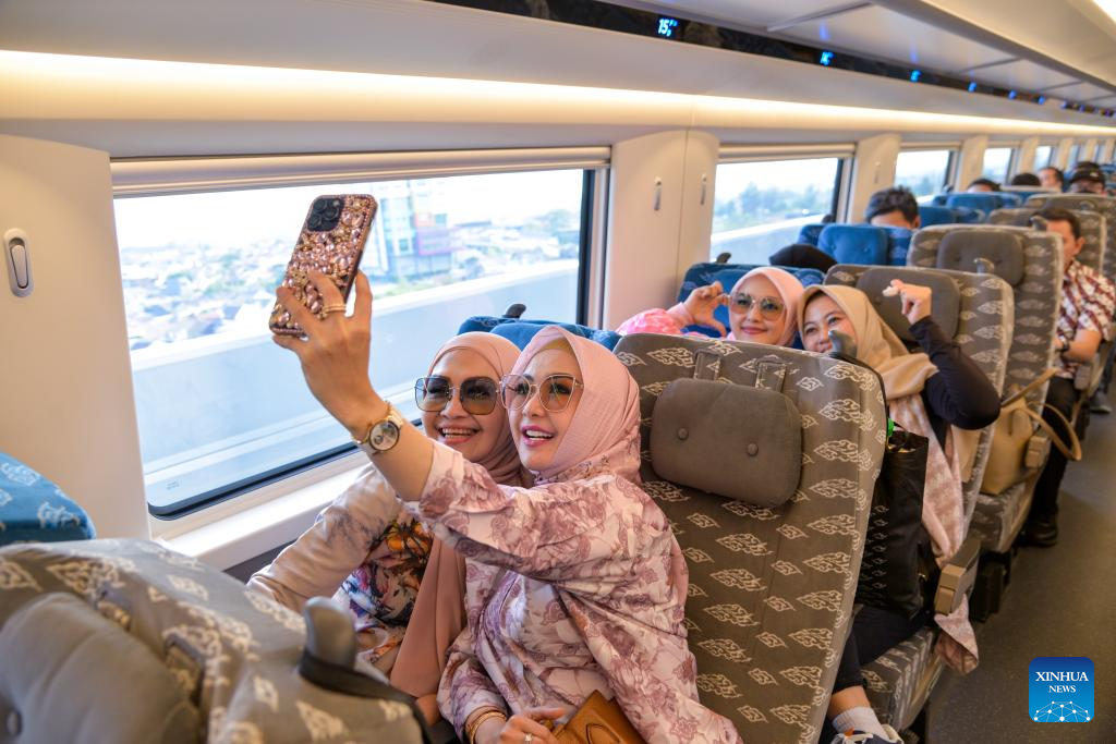 Passengers pose for photos in a carriage of a high-speed electrical multiple unit (EMU) train running on the Jakarta-Bandung High-Speed Railway in Indonesia, Oct. 17, 2023. The Jakarta-Bandung High-Speed Railway (HSR) jointly built by China and Indonesia was officially put into commercial operation on Tuesday.