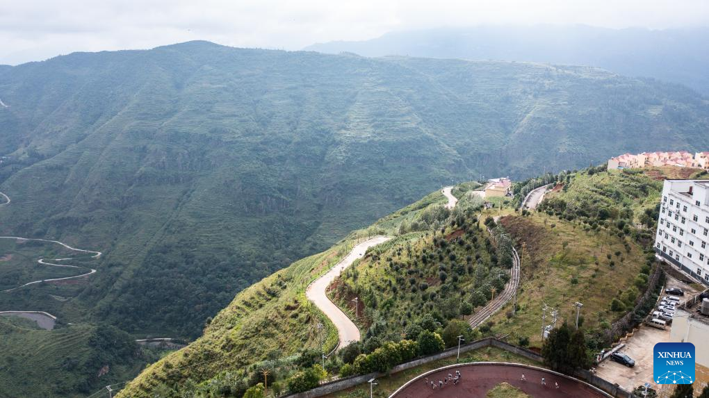 This aerial photo taken on Sept. 21, 2023 shows new energy vehicles charging at a charging pile (bottom, R) in Wumeng Township of Panzhou City, southwest China's Guizhou Province. In recent years, the Guizhou Power Grid Co., Ltd of China Southern Power Grid has been working diligently to extend the charging network for new energy vehicles to the rural areas. Charging piles are now available in every township in Guizhou thanks to well orchestrated efforts to fully meet the public's demand for eco-friendly transportation in the past few years. (Xinhua/Tao Liang)