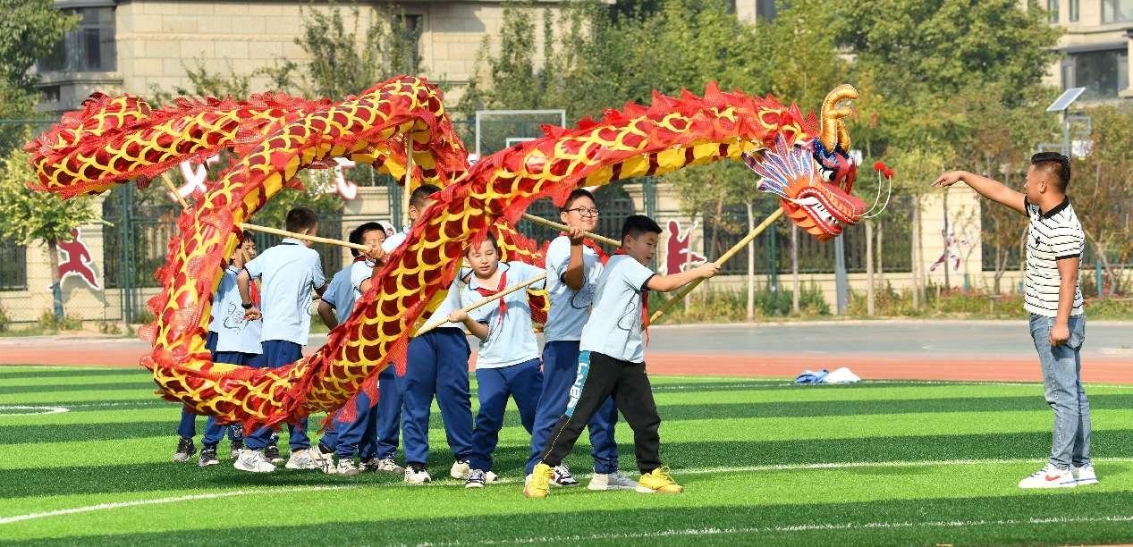 Students of an elementary school in Cangzhou, north China's Hebei province, practice dragon dancing under the guidance of a teacher. (People's Daily Online/Yuan Liwei)