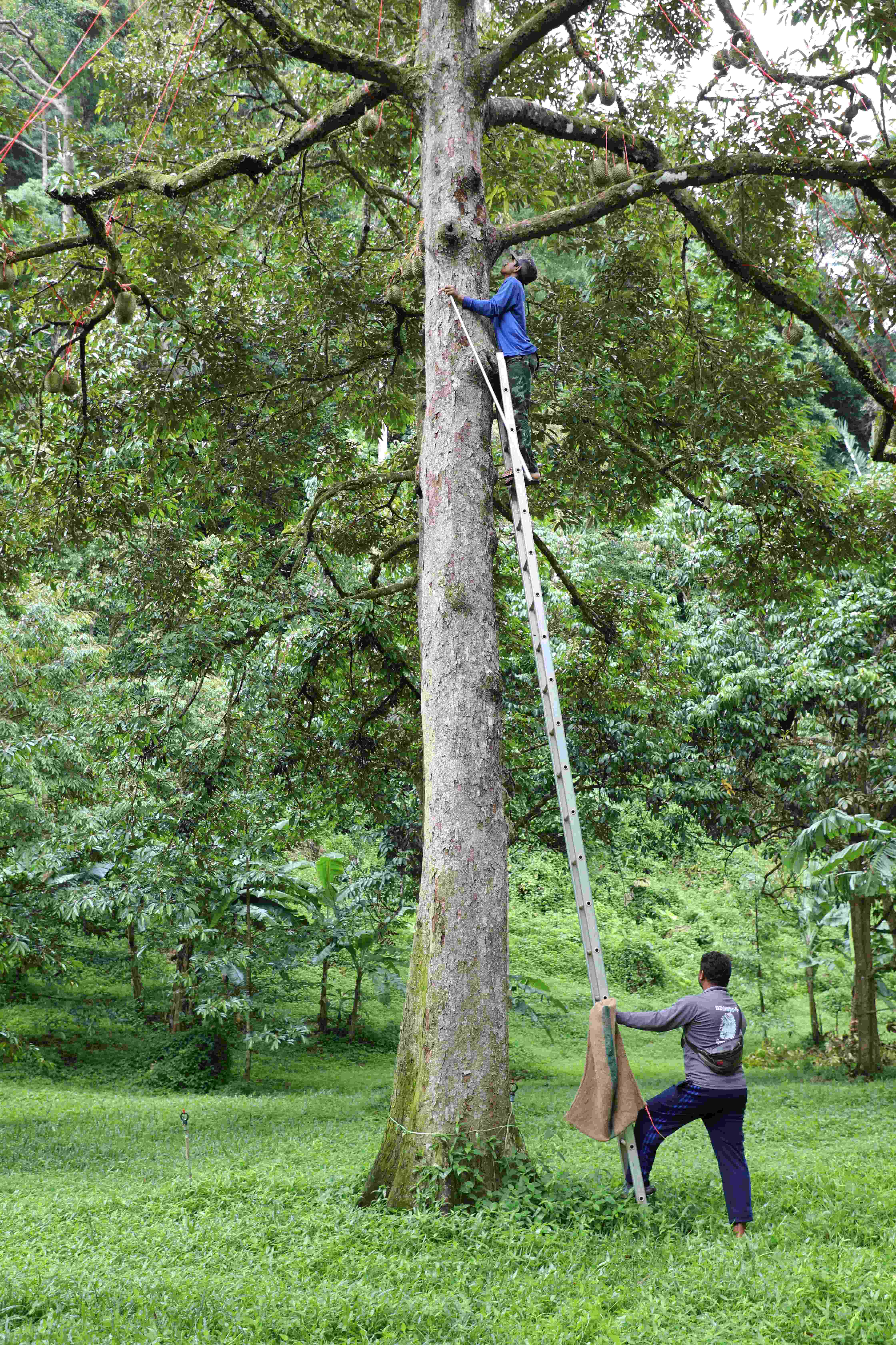 A worker named Wichai stood atop a durian tree that towered over ten meters in height. With a swing of his knife, a durian weighing several kilograms fell to the ground.