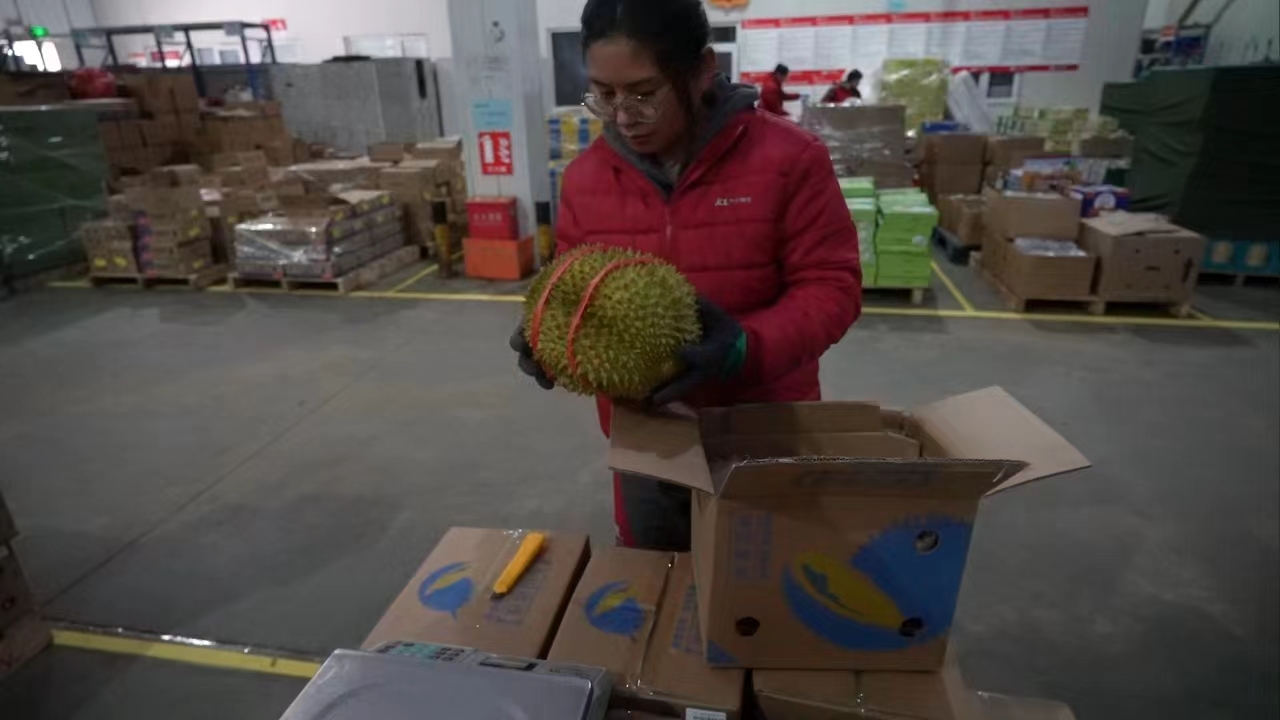 A staff member checks durians at a warehouse of China's e-commerce giant JD.com in Tongzhou district, Beijing. (Photo/Yang Haoming)