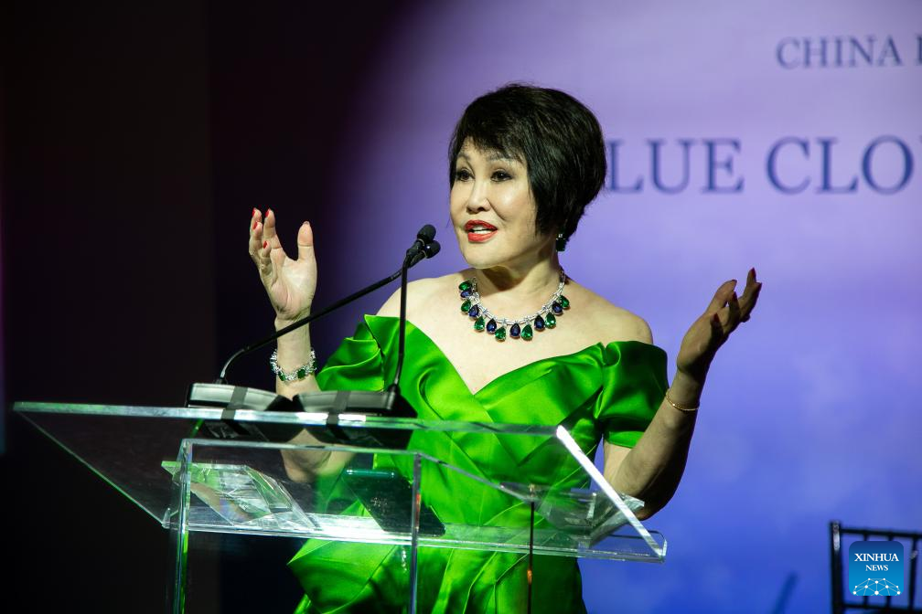 Chinese-American Emmy-award-winning television host Yue-Sai Kan speaks during the China Institute's annual Blue Cloud gala in New York, the United States, on Oct. 17, 2023. The China Institute's annual Blue Cloud gala honored here Tuesday eight people for promoting cross-cultural understanding between China and the United States. (Photo by Michael Nagle/Xinhua)