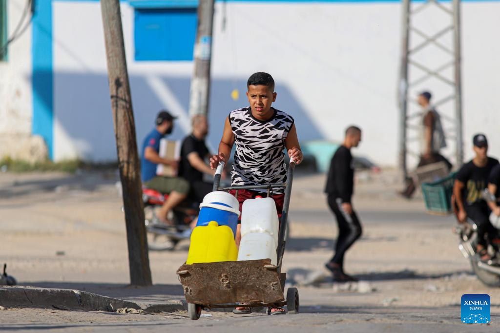 A Palestinian young man transports water in the southern Gaza Strip city of Khan Younis, on Oct. 18, 2023. The Palestinian Islamic Resistance Movement (Hamas) on Oct. 7 showered Israel with thousands of rockets in a rare surprise attack, to which Israel responded with massive airstrikes on Gaza and punitive measures, including a siege on the enclave with supplies of water, electricity, fuel, and other necessities being cut off. The ongoing Israel-Hamas conflict, as it entered the 12th day, has killed more than 4,000 people on both sides. (Photo by Rizek Abdeljawad/Xinhua)