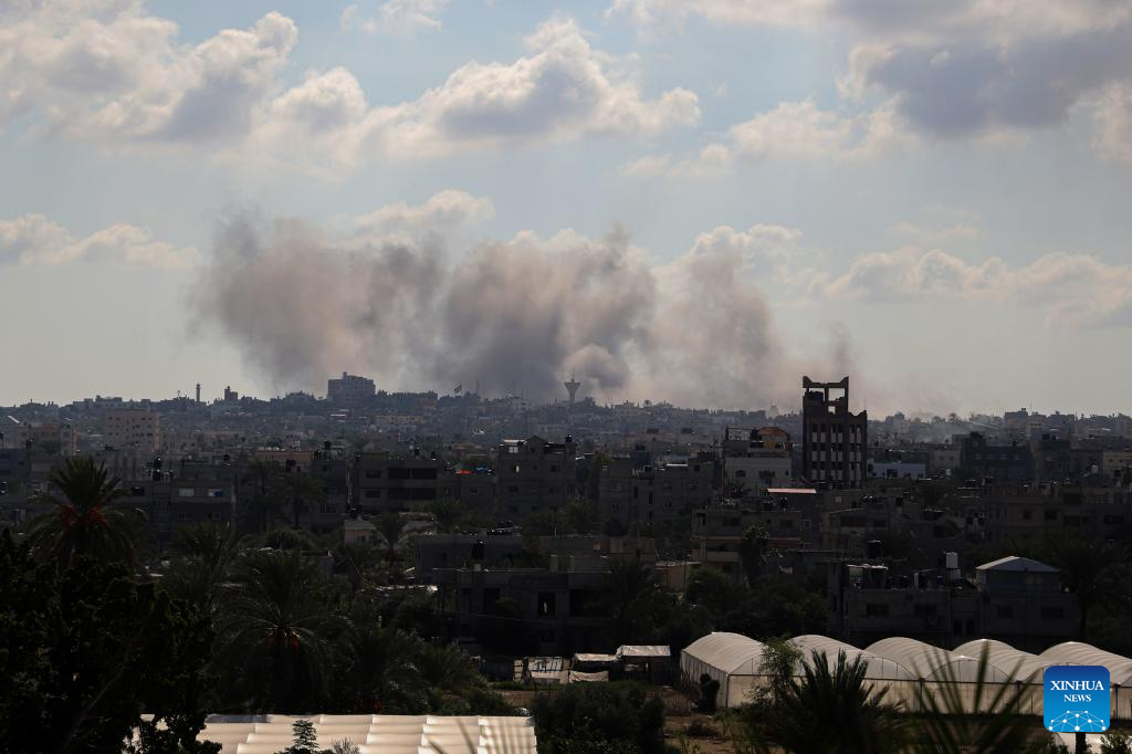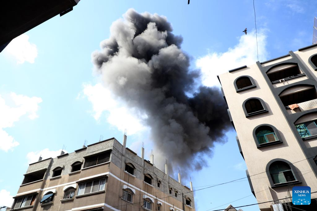Smoke rises following an Israeli airstrike in the southern Gaza Strip city of Khan Younis, on Oct. 18, 2023. The Palestinian Islamic Resistance Movement (Hamas) on Oct. 7 showered Israel with thousands of rockets in a rare surprise attack, to which Israel responded with massive airstrikes on Gaza and punitive measures, including a siege on the enclave with supplies of water, electricity, fuel, and other necessities being cut off. The ongoing Israel-Hamas conflict, as it entered the 12th day, has killed more than 4,000 people on both sides. (Photo by Rizek Abdeljawad/Xinhua)