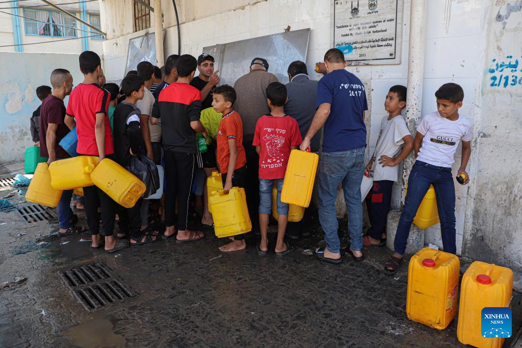 Palestinians fetch water in the southern Gaza Strip city of Khan Younis, on Oct. 18, 2023. The Palestinian Islamic Resistance Movement (Hamas) on Oct. 7 showered Israel with thousands of rockets in a rare surprise attack, to which Israel responded with massive airstrikes on Gaza and punitive measures, including a siege on the enclave with supplies of water, electricity, fuel, and other necessities being cut off. The ongoing Israel-Hamas conflict, as it entered the 12th day, has killed more than 4,000 people on both sides. (Photo by Rizek Abdeljawad/Xinhua)