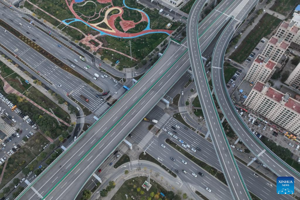 This aerial photo taken on Oct. 17, 2023 shows a view of roads in Lanzhou New Area of northwest China's Gansu Province. (Xinhua/Ma Xiping)