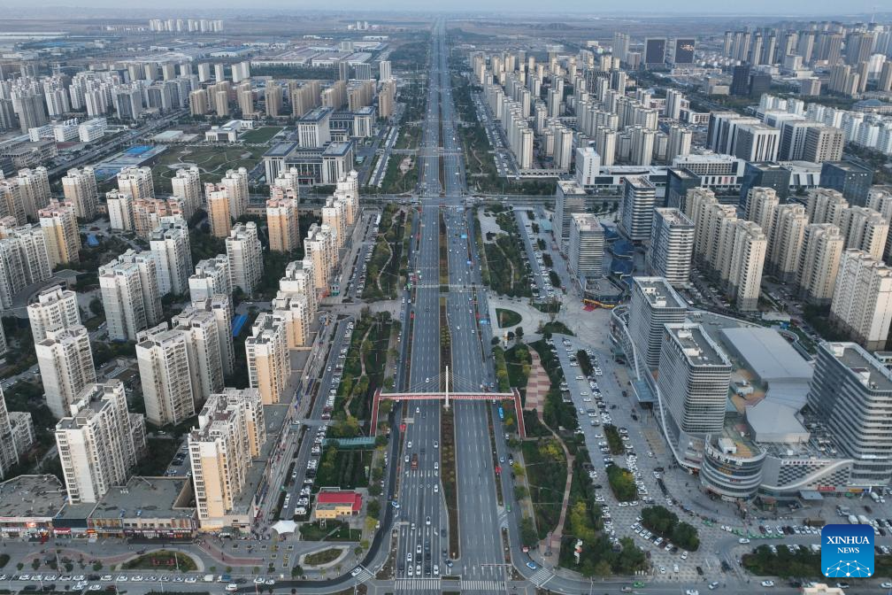 This aerial photo taken on Oct. 17, 2023 shows a city view of Lanzhou New Area in northwest China's Gansu Province. (Xinhua/Ma Xiping)?