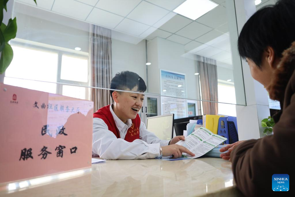 A community worker helps a local resident at a service counter in Lanzhou New Area of northwest China's Gansu Province, Oct. 17, 2023. (Xinhua/Ma Xiping)