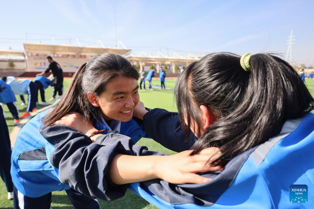 Students of Lanzhou New Area Senior High School have PE class at the school in Lanzhou New Area of northwest China's Gansu Province, Oct. 16, 2023. (Xinhua/Ma Xiping)