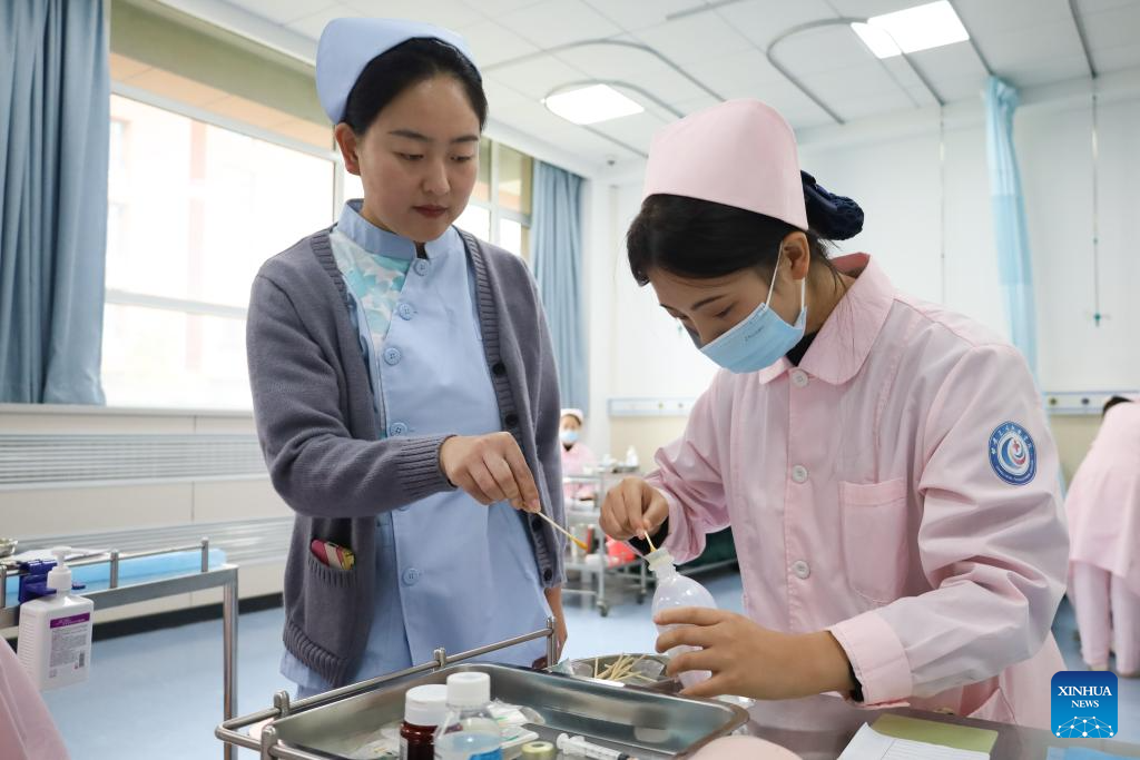 A teacher (L) of Gansu Health Vocational College instructs a student on basic nursing skills at the college in Lanzhou New Area of northwest China's Gansu Province, Oct. 17, 2023. (Xinhua/Ma Xiping)