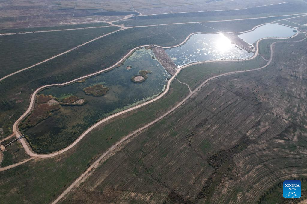 This aerial photo taken on Oct. 16, 2023 shows a view of an ecological management project of Shuifu River at a modern agricultural park in Lanzhou New Area in northwest China's Gansu Province. (Xinhua/Fan Peishen)