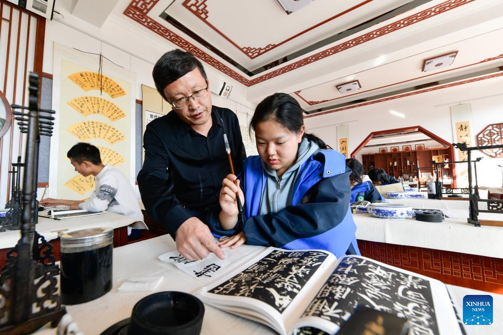 Students of Lanzhou New Area Senior High School have calligraphy class at the school in Lanzhou New Area of northwest China's Gansu Province, Oct. 16, 2023. (Xinhua/Fan Peishen)
