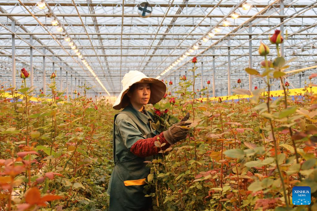 A worker harvests roses at the flowers base of a modern agricultural demonstration garden in Lanzhou New Area of northwest China's Gansu Province, Oct. 17, 2023. (Xinhua/Ma Xiping)