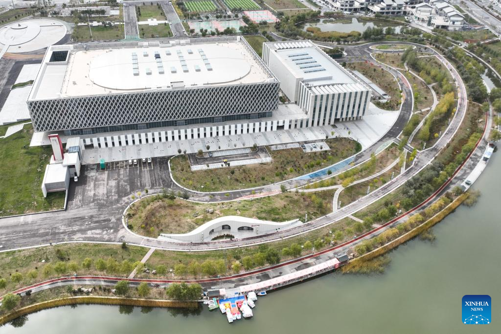 This aerial photo taken on Oct. 17, 2023 shows a view of the provincial gymnasium and its nearby Wenqu Lake at Lanzhou New Area in northwest China's Gansu Province. (Xinhua/Ma Xiping)
