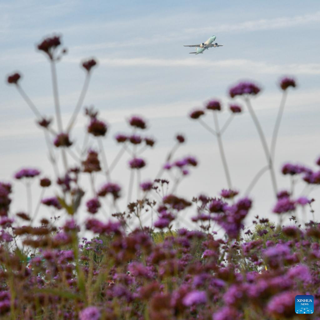 This photo taken on Oct. 16, 2023 shows a plane taking off from Zhongchuan International Airport at Lanzhou New Area in northwest China's Gansu Province. (Xinhua/Fan Peishen)
