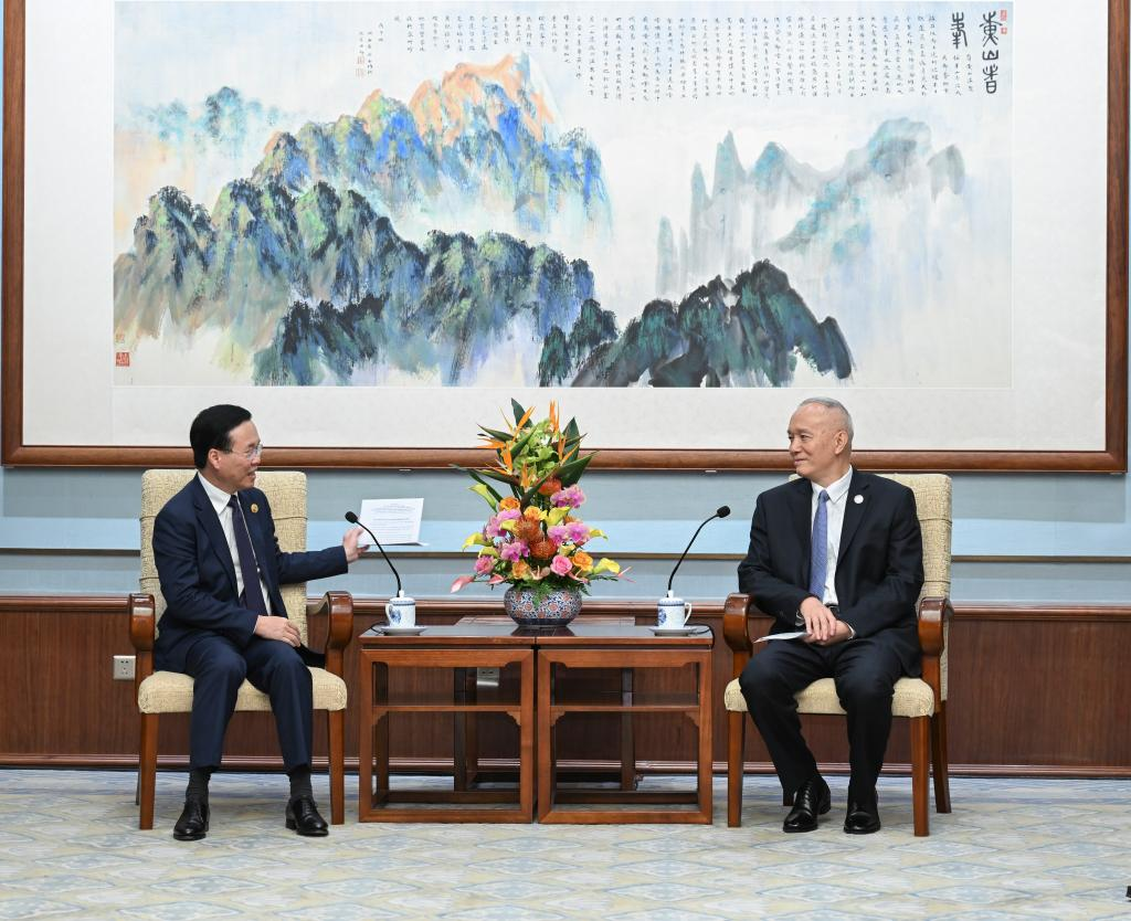 Cai Qi, a member of the Standing Committee of the Political Bureau of the Communist Party of China (CPC) Central Committee and a member of the Secretariat of the CPC Central Committee, meets with Vietnamese President Vo Van Thuong in Beijing, capital of China, Oct. 19, 2023. (Xinhua/Zhang Ling)