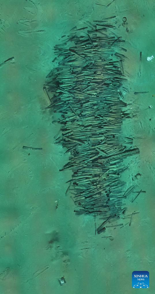This undated orthophoto shows the site of an ancient shipwreck discovered in the South China Sea. (National Cultural Heritage Administration/Handout via Xinhua)