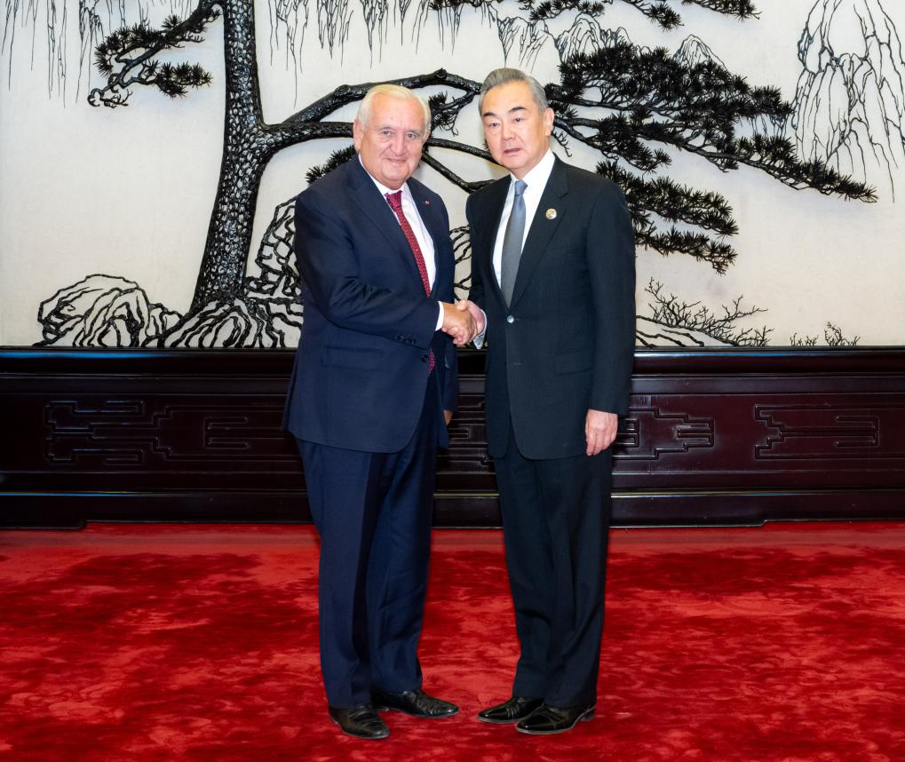 Chinese Foreign Minister Wang Yi, also a member of the Political Bureau of the Communist Party of China Central Committee, meets with Jean-Pierre Raffarin, special representative of French President Emmanuel Macron and former French prime minister, who is in Beijing for the third Belt and Road Forum for International Cooperation, at the Great Hall of the People in Beijing, capital of China, Oct. 19, 2023. (Xinhua/Zhai Jianlan)