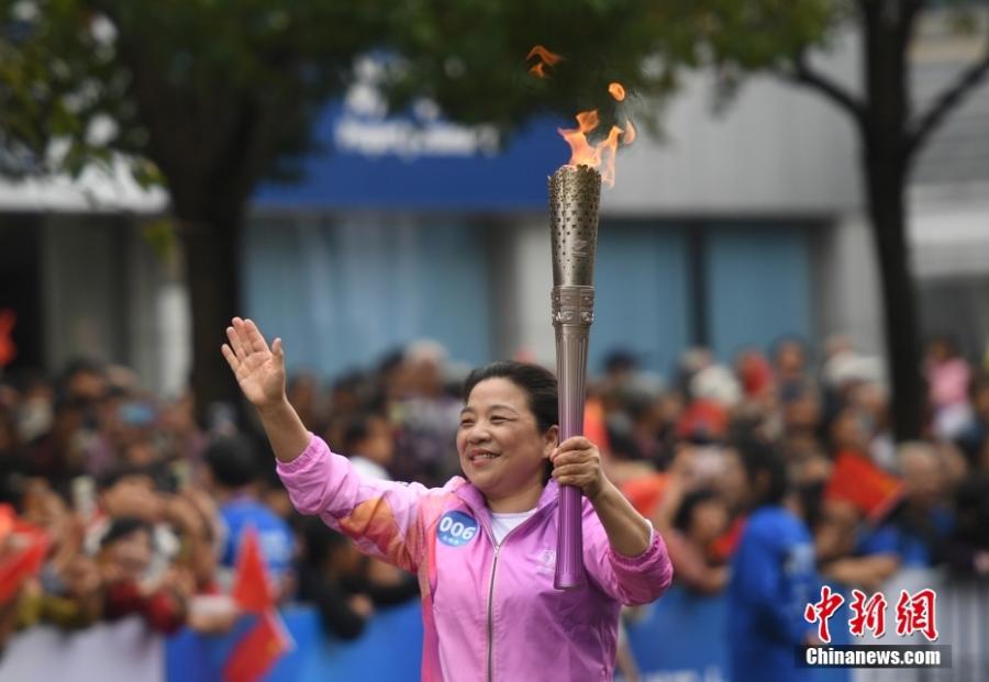 Torch bearer Xu Qin takes part in the torch relay of the 4th Asian Para Games in Chun'an County, Hangzhou, east China's Zhejiang Province, Oct. 19, 2023. (Photo: China News Service/Wang Gang)