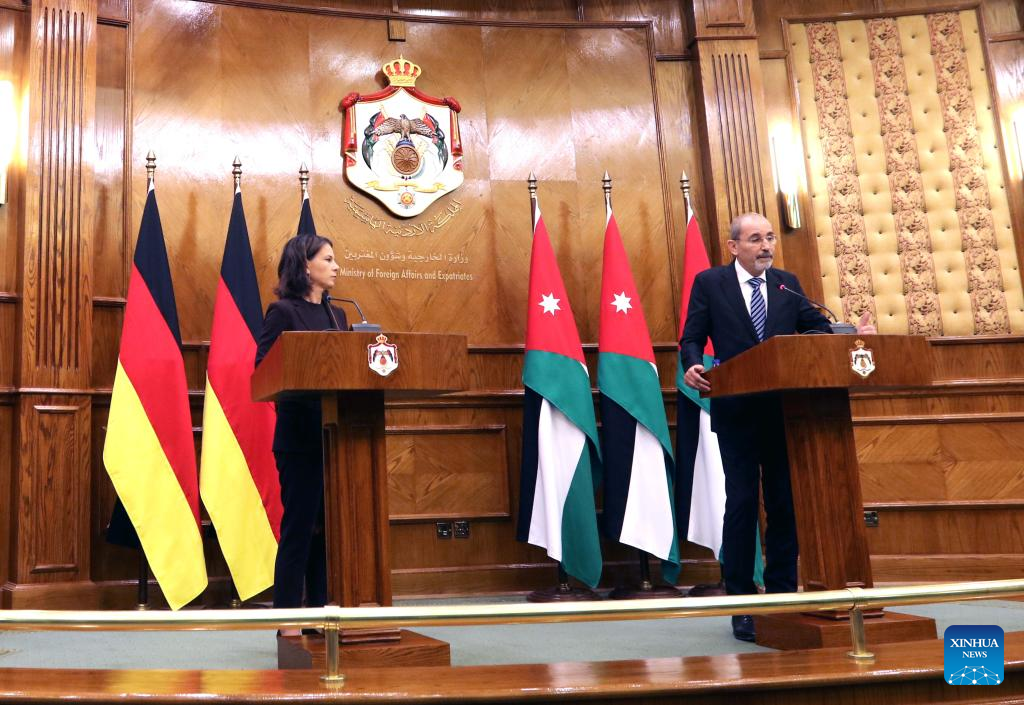 Jordanian Foreign Minister Ayman Safadi (R) and German Foreign Minister Annalena Baerbock attend a joint press conference in Amman, Jordan, on Oct. 19, 2023. Safadi said on Thursday that the kingdom's priority is to immediately stop the Israel-Hamas conflict in Gaza while delivering humanitarian aid. (Photo by Mohammad Abu Ghosh/Xinhua)