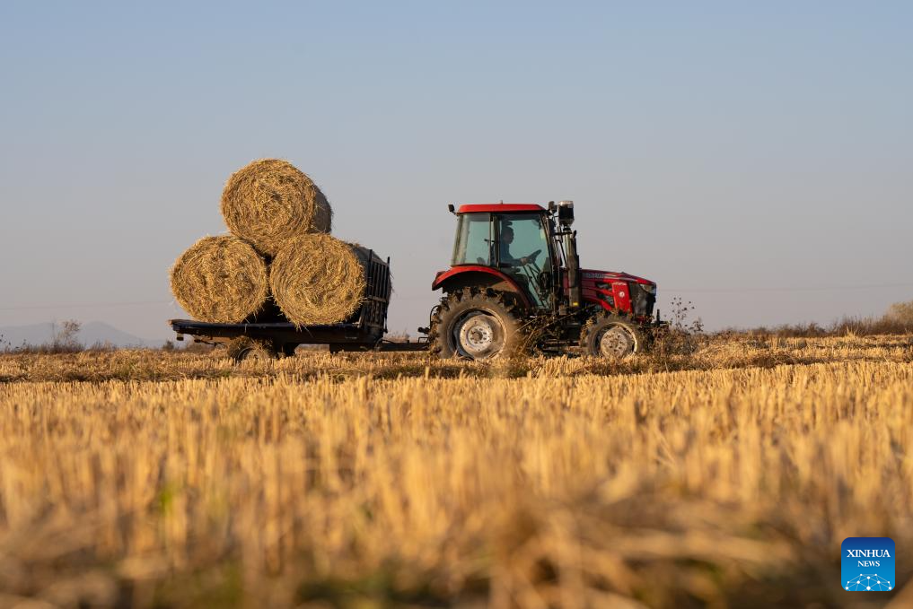 A farmer drives a farming machine to deliver packed straw in Shangzhi City, northeast China's Heilongjiang Province, Oct. 18, 2023. China's top grain producer Heilongjiang Province is embracing the harvest season of this year while preparing for next year's planting. (Xinhua/Wang Dayu)