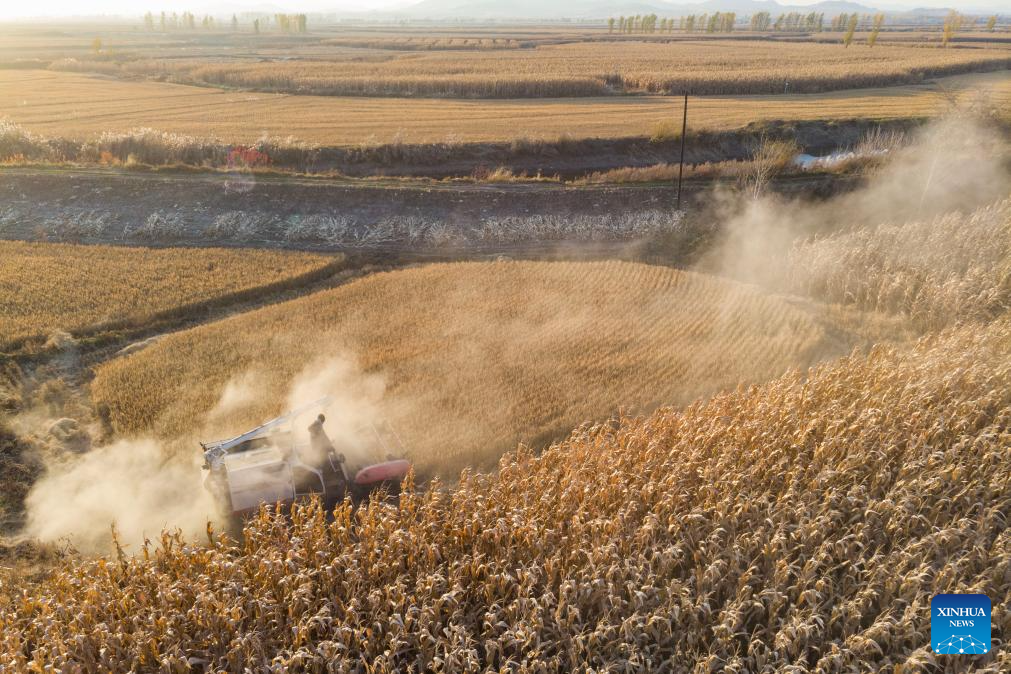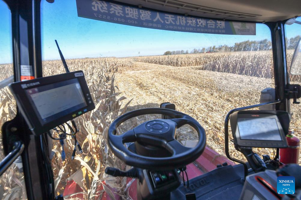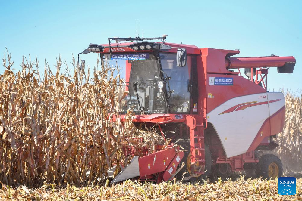 A driverless agricultural machine harvests corn at a farm in Gongzhuling, northeast China's Jilin Province, Oct. 19, 2023. China's Jilin Province is embracing the harvest season of this year. (Xinhua/Zhang Nan)