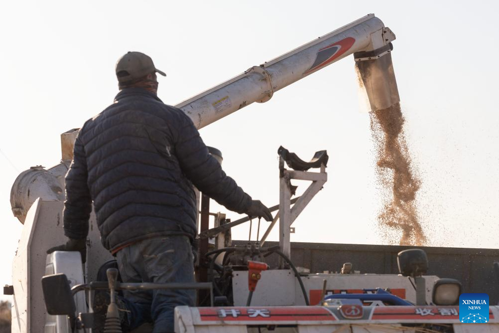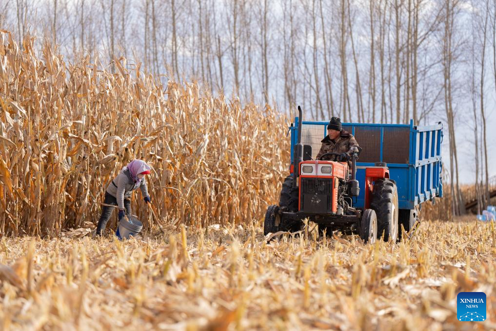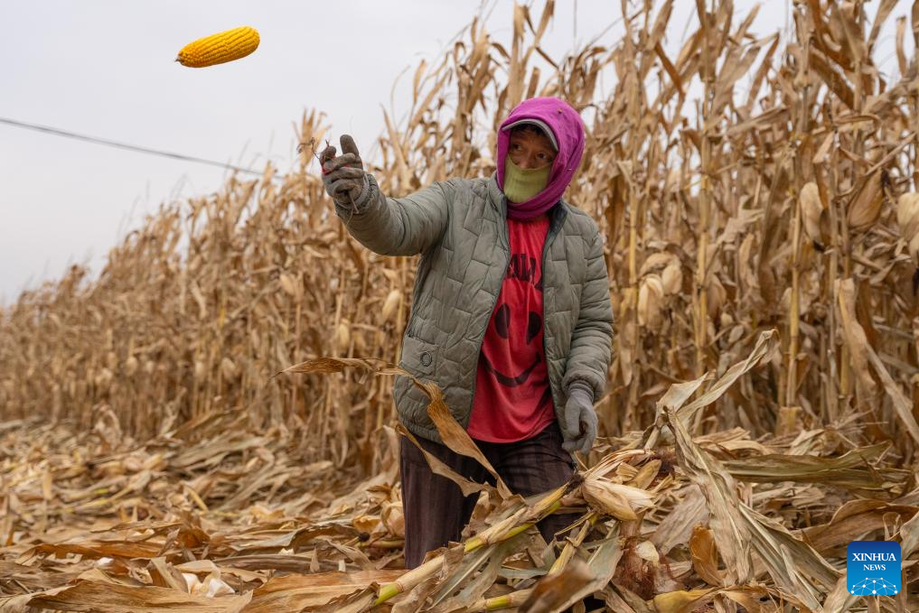 A farmer transfers harvested corn in Dongsheng Village of Zhaodong City, northeast China's Heilongjiang Province, Oct. 19, 2023. China's top grain producer Heilongjiang Province is embracing the harvest season of this year while preparing for next year's planting. (Xinhua/Wang Dayu)