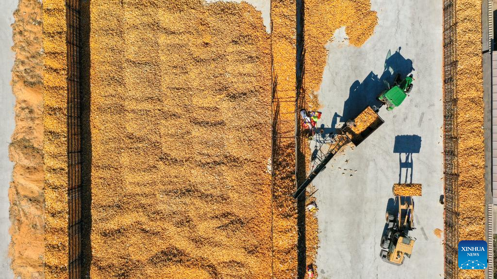 Harvested corn are transferred in Gongzhuling, northeast China's Jilin Province, Oct. 19, 2023. China's Jilin Province is embracing the harvest season of this year. (Xinhua/Zhang Nan)