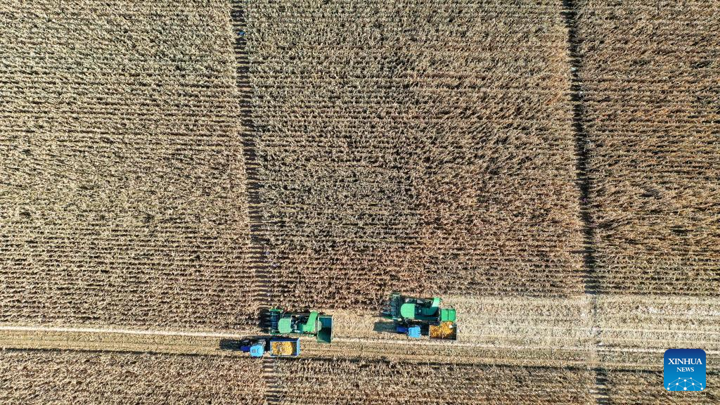 This aerial photo taken on Oct. 19, 2023 shows farmers harvesting corn in Dongsheng Village of Zhaodong City, northeast China's Heilongjiang Province. China's top grain producer Heilongjiang Province is embracing the harvest season of this year while preparing for next year's planting. (Xinhua/Xie Jianfei)