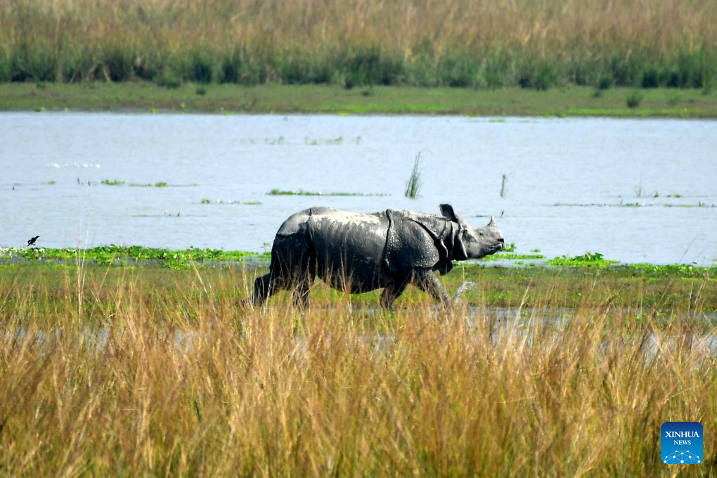An Indian one-horned rhino walks inside the Pobitora Wildlife Sanctuary in Morigaon district of India's northeastern state of Assam, Oct. 20, 2023. Pobitora reopened for the tourist season after monsoon floods. (Str/Xinhua)