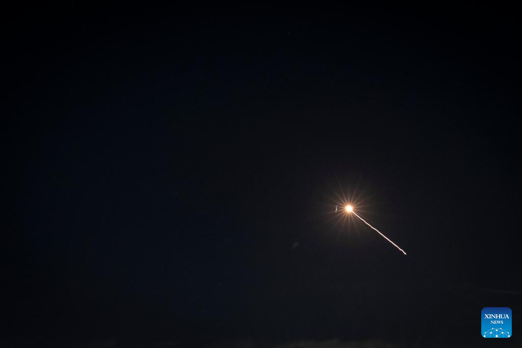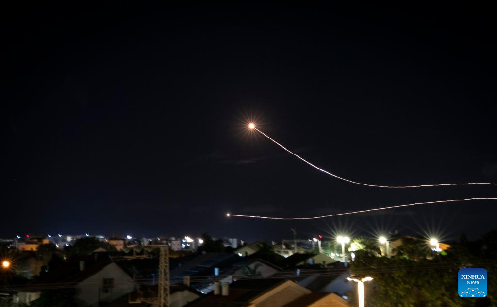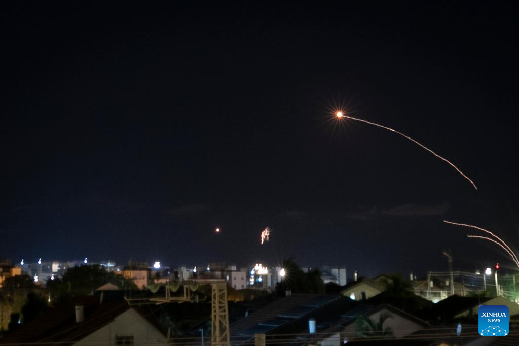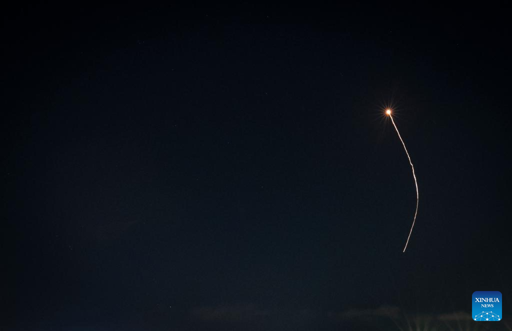 Israel's Iron Dome anti-missile system intercepts rockets launched from the Gaza Strip, as seen from Netivot, southern Israel, Oct. 20, 2023. (Xinhua/Chen Junqing)