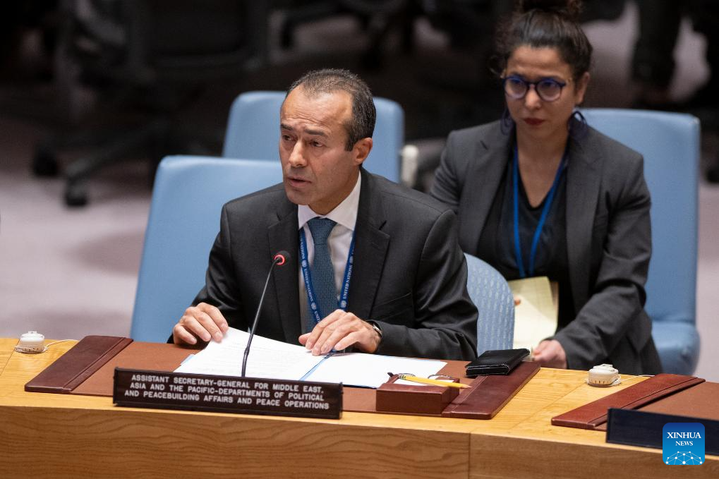 Khaled Khiari (Front), the UN assistant secretary-general for Middle East, Asia and the Pacific, speaks at a high-level debate of the UN Security Council on the contribution of regional, subregional and bilateral arrangements to the prevention and peaceful resolution of disputes at the UN headquarters in New York, on Oct. 20, 2023. (Manuel Elias/UN Photo/Handout via Xinhua)