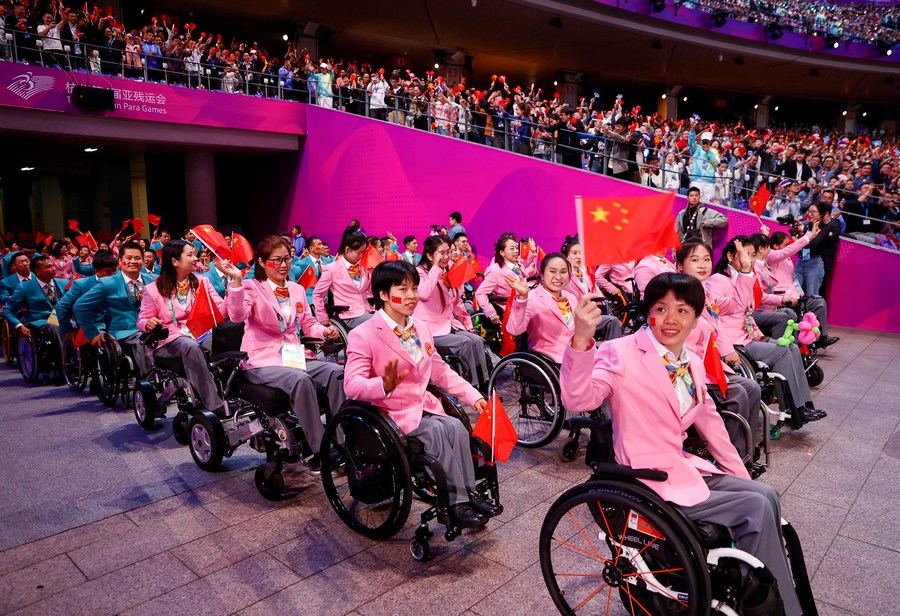 China's delegation parades into the Hangzhou Olympic Sports Center Stadium during the opening ceremony of the Asian Para Games. (Xinhua/Yang Zhisen)