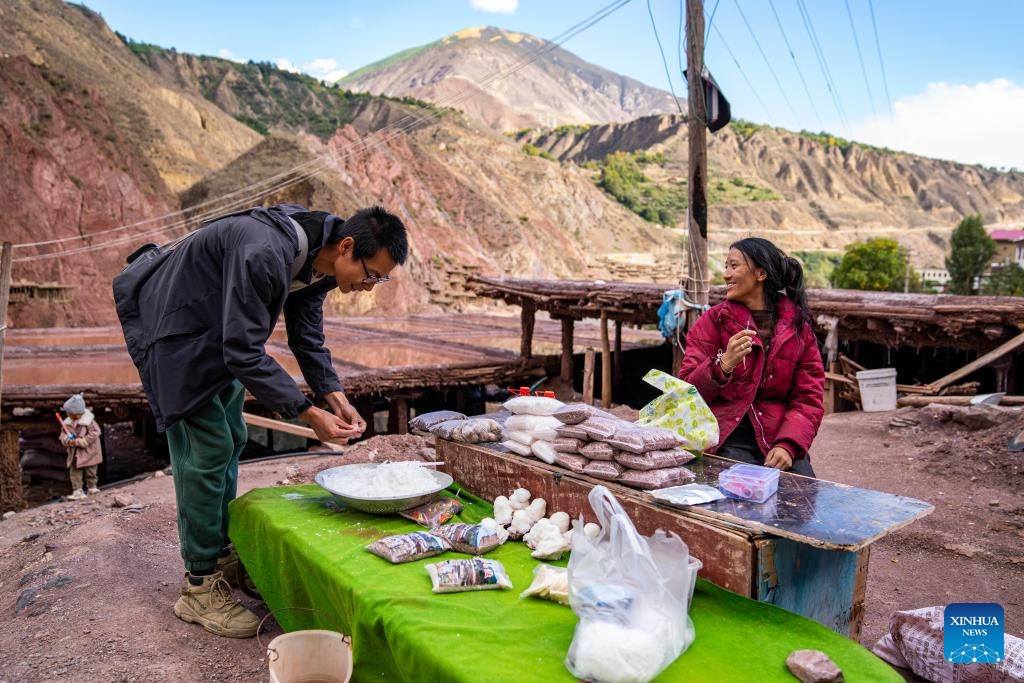 A villager promotes salt produced by her family to a tourist near a salt field in Naxi Ethnic Township of Markam County in the city of Qamdo, southwest China's Tibet Autonomous Region, Oct. 20, 2023. Markam County is known as a place with rich salt resources since ancient China. Salt fields are mainly built on cliff slopes and riversides of the Lancang River. Local people in Naxi evaporate brine in the sun with an ancestral technique since Tang Dynasty (618-907 AD). With a large amount of yearly output of salt products, salt-production has become a main income for local people. Furthermore, the salt fields here and local folk customs also become a unique attraction to visitors. (Xinhua/Sun Fei)