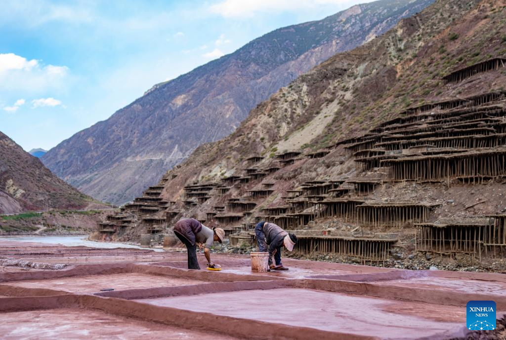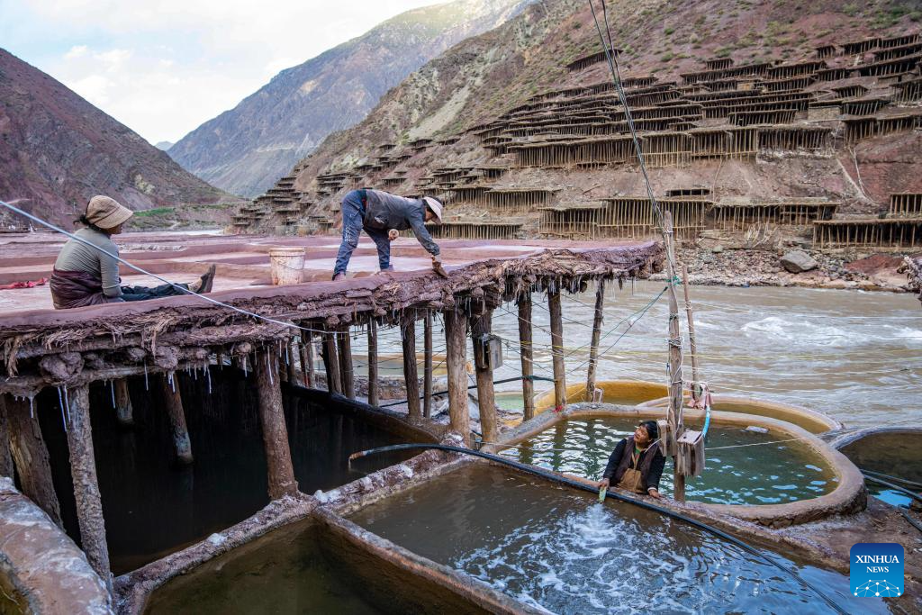 Villagers work at a salt field in Naxi Ethnic Township of Markam County in the city of Qamdo, southwest China's Tibet Autonomous Region, Oct. 20, 2023. Markam County is known as a place with rich salt resources since ancient China. Salt fields are mainly built on cliff slopes and riversides of the Lancang River. Local people in Naxi evaporate brine in the sun with an ancestral technique since Tang Dynasty (618-907 AD). With a large amount of yearly output of salt products, salt-production has become a main income for local people. Furthermore, the salt fields here and local folk customs also become a unique attraction to visitors. (Xinhua/Sun Fei)