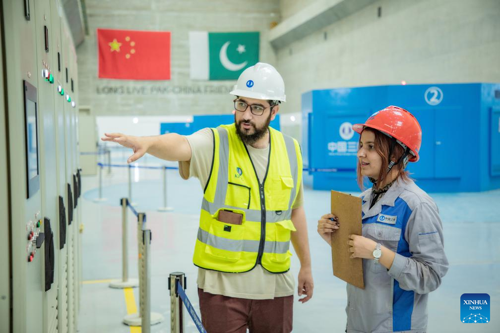 Moaaz Awan (L) works at the Karot Hydropower Plant in Pakistan's eastern Punjab province in May 2023. (Xinhua)