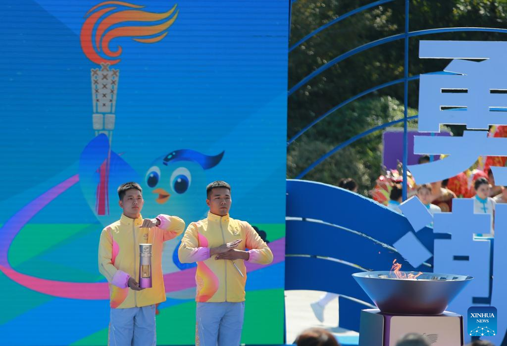 Photo shows the flame retrieval ceremony of the torch relay of the 4th Asian Para Games in Hangzhou, east China's Zhejiang Province, Oct. 21, 2023 (Photo by Weng Xinyang/Xinhua)
