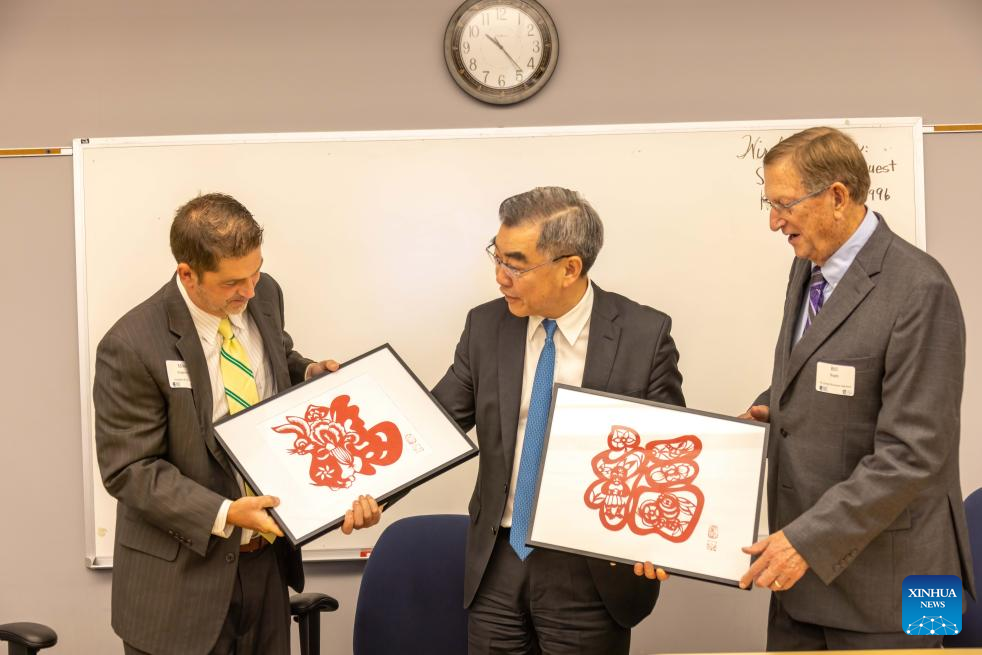 Chinese Consul General in New York Huang Ping (C) presents gifts to Michael Grigalonis (L), Chester County Economic Development Council (CCEDC) president and chief operating officer, and F. William Bogle, chairman of the Pennsylvania Global Business Advisors, at a meeting at the CCEDC in Exton, Pennsylvania, the United States, Oct. 20, 2023.(Photo by Winston Zhou/Xinhua)