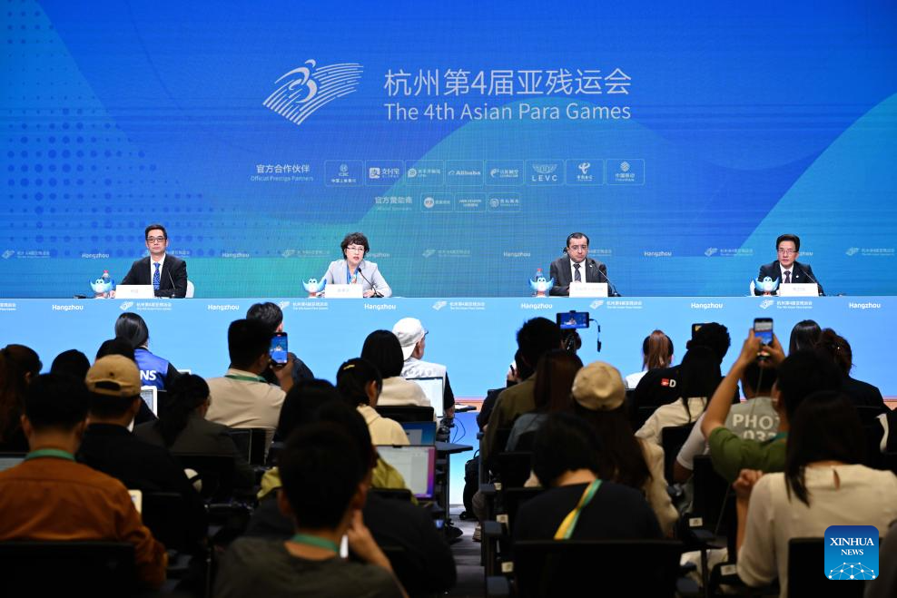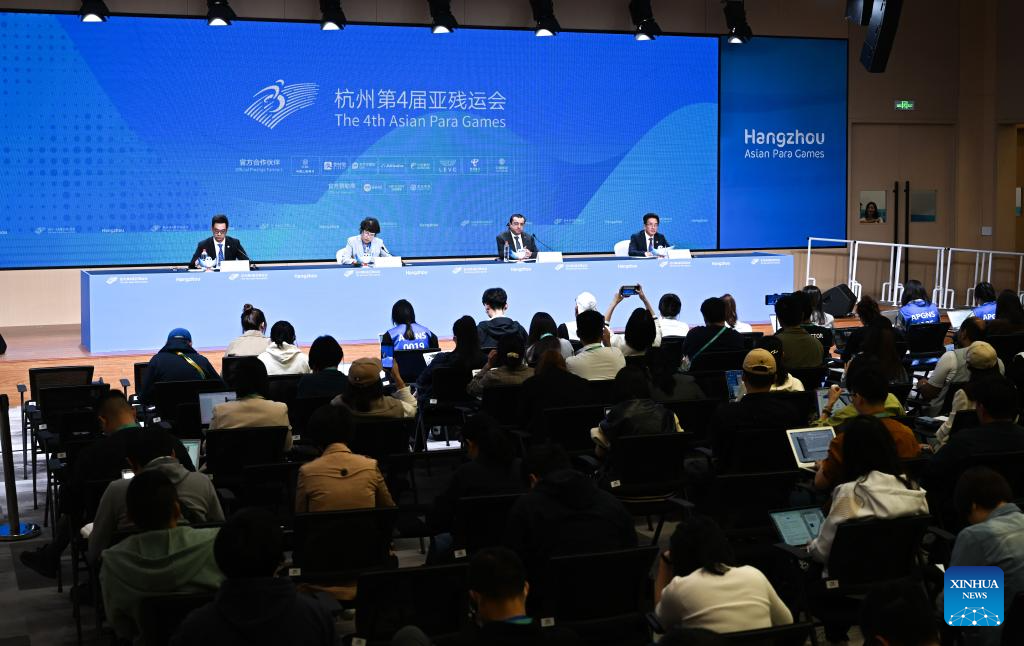 Photo taken on Oct. 22, 2023 shows the venue of the joint press conference by the Asian Paralympic Committee (APC) and the Hangzhou Asian Para Games Organizing Committee (HAPGOC) in Hangzhou, east China's Zhejiang Province. (Xinhua/Bei He)
