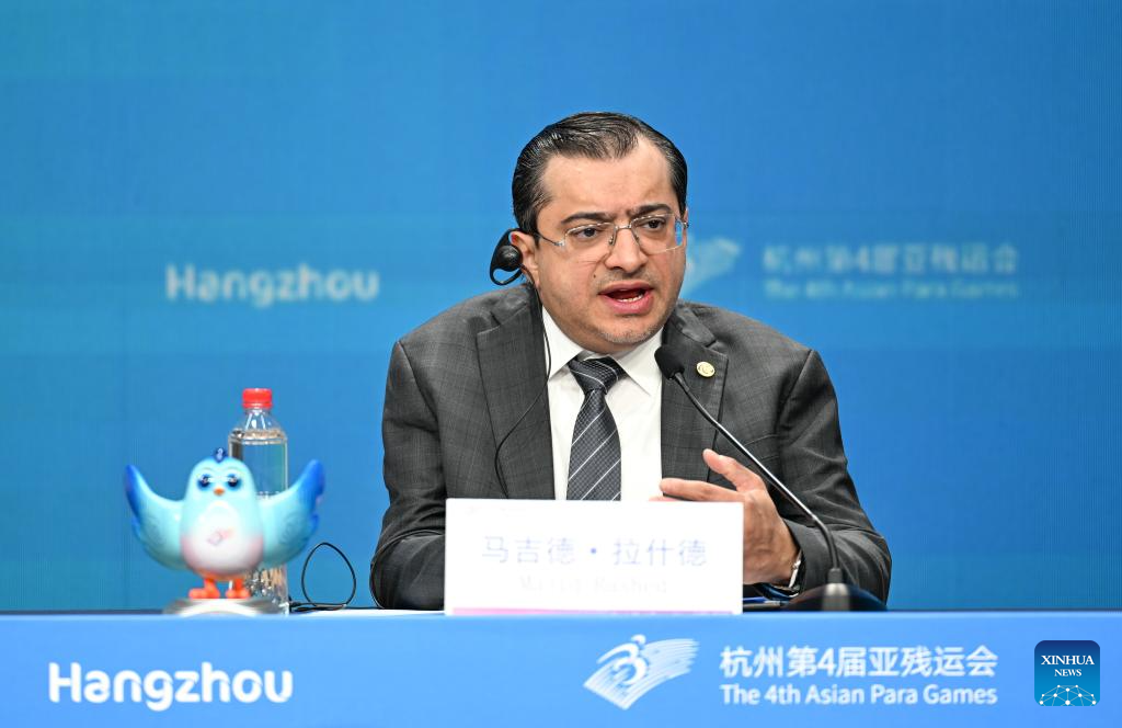Majid Rashed, president of the Asian Paralympic Committee, speaks during the joint press conference by the Asian Paralympic Committee (APC) and the Hangzhou Asian Para Games Organizing Committee (HAPGOC) in Hangzhou, east China's Zhejiang Province, Oct. 22, 2023. (Xinhua/Bei He)