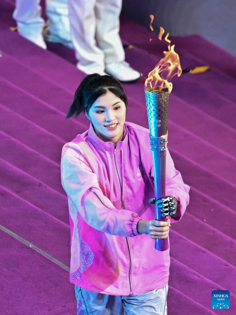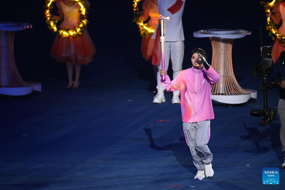 Torch bearer Xu Jialing relays the torch during the opening ceremony of the 4th Asian Para Games in Hangzhou of east China's Zhejiang Province, on Oct. 22, 2023. (Xinhua/Bei He)